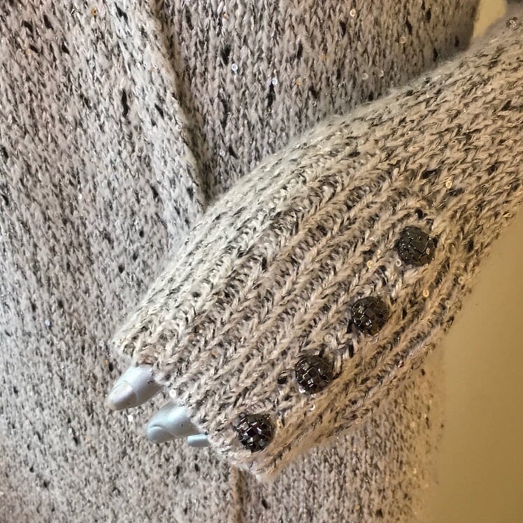 This beautiful duster cardigan has button sleeve details and sparkly sequins throughout.